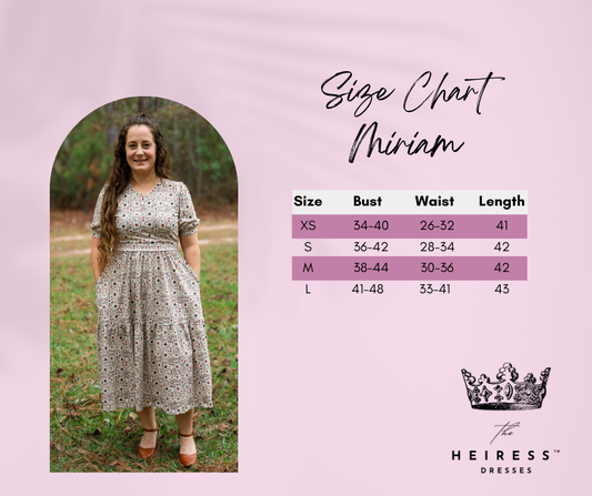 Our second dress, Heirloom Heart, is in our Miriam Dress style, previously released. This dress, with its tiered skirt and short puffed and banded sleeves, is graceful yet strong—much like Miriam, the sister of Moses and Aaron. In Scripture, Miriam is remembered as a prophetess and leader, who courageously watched over her baby brother on the Nile (Exodus 2:4) and later led the women of Israel in song and dance after the Lord delivered them at the Red Sea (Exodus 15:20–21).