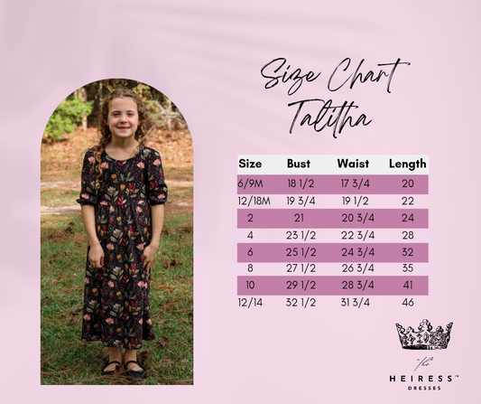 Our first dress for girls is the Talitha in Bethlehem Bloom—a sweet, twirly little-girl dress inspired by the biblical phrase “Talitha koum,” meaning “little girl, arise.” (Mark 5:41) With its long, billowy sleeves and playful, flowy silhouette, the Talitha is designed for joyful movement and precious Christmas memories.